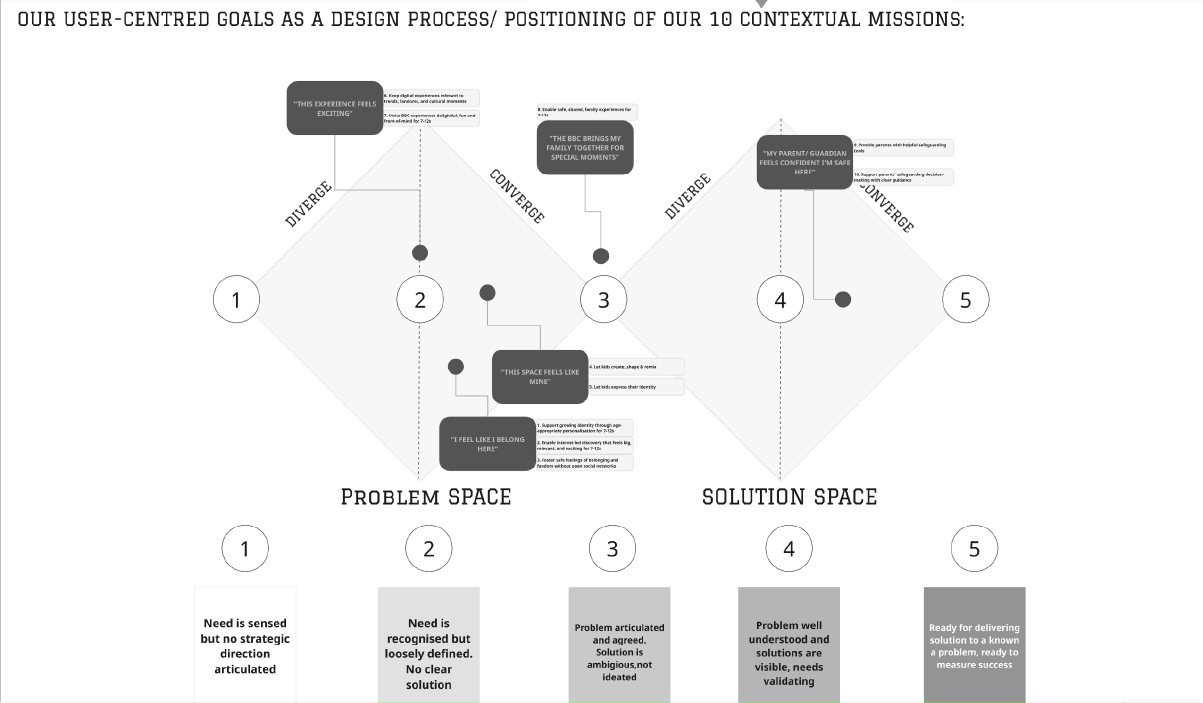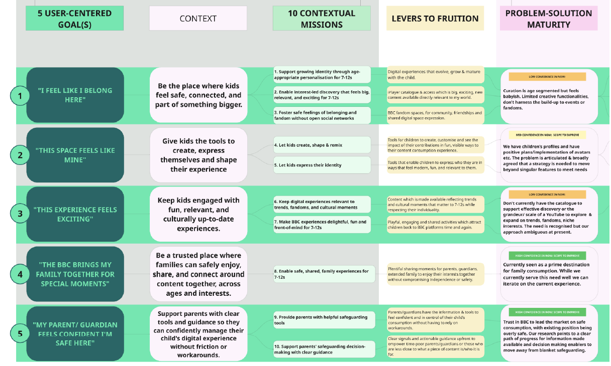 Synthesis of a large body of qualitative and quantitative research with Children, Young People & Family audiences of the BBC down into 5 User-Centered Goals with connected levers to achieve fruition around these goals, analysis of the BBC’s current positioning against each audience goal, as well as opportunity/ solution tree mapping.