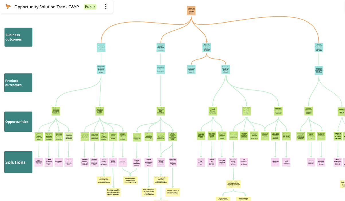 Narrowing down a large scale qualitative and quantitative research study (over 1000+ individuals) into actionable UX goals, business logic and technical capabilities in the form of Opportunity Solution Tree visualisation and delivery planning. Honing-in on 5 high-level goals to improve Children & Young People’s experience across multiple touch-points with the BBC.
